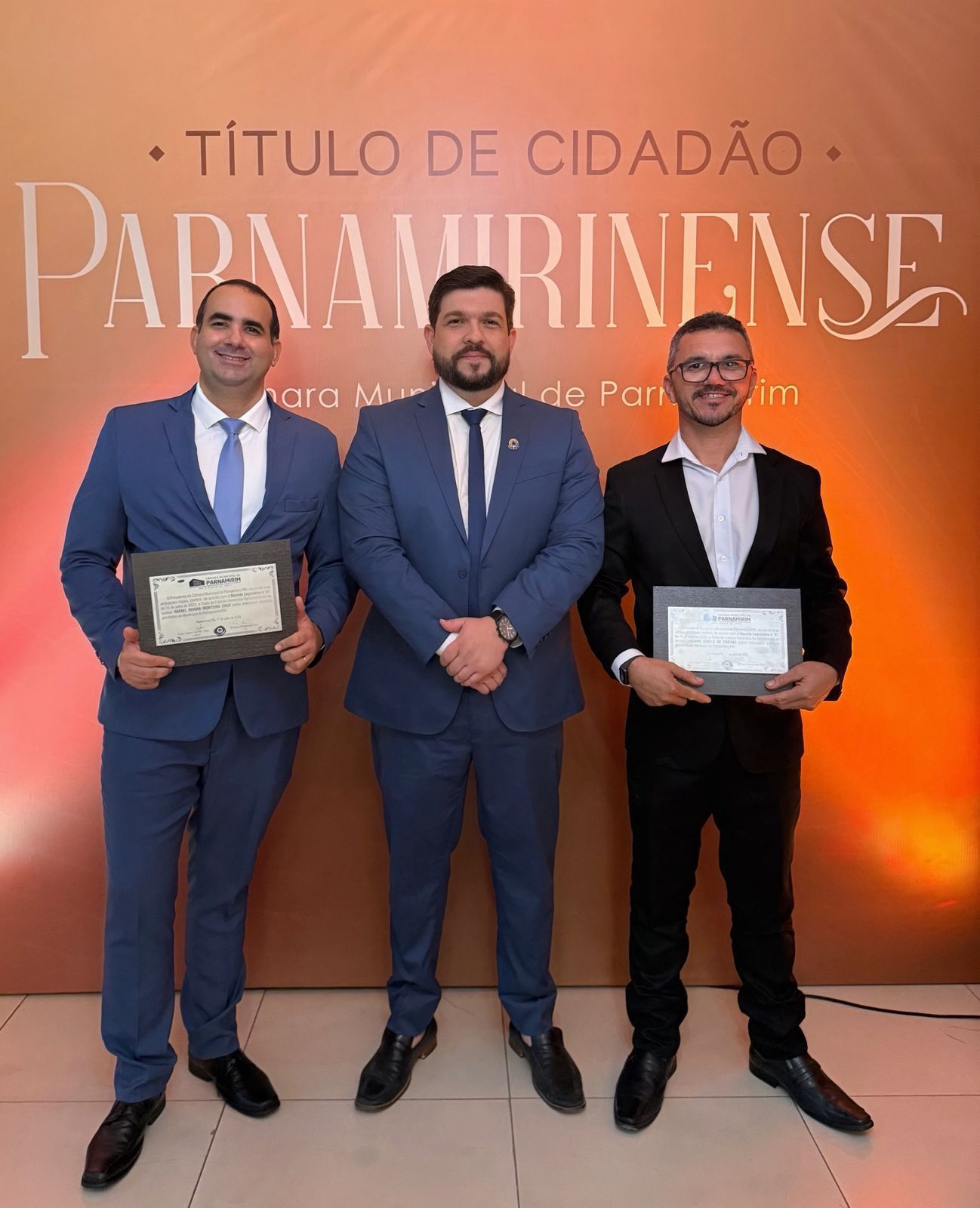 Luciano, empresário do ramo automotivo com 14 anos de atuação na cidade, e Rafael, servidor da UFRN e especialista em gestão pública, foram elogiados por Rodrigo Cruz em seu discurso: “São homens que escolheram Parnamirim para construir suas vidas e, com trabalho sério, ajudam a escrever a história do nosso município”. Emocionados, os homenageados agradeceram a distinção e reforçaram o compromisso de continuar contribuindo com a cidade.