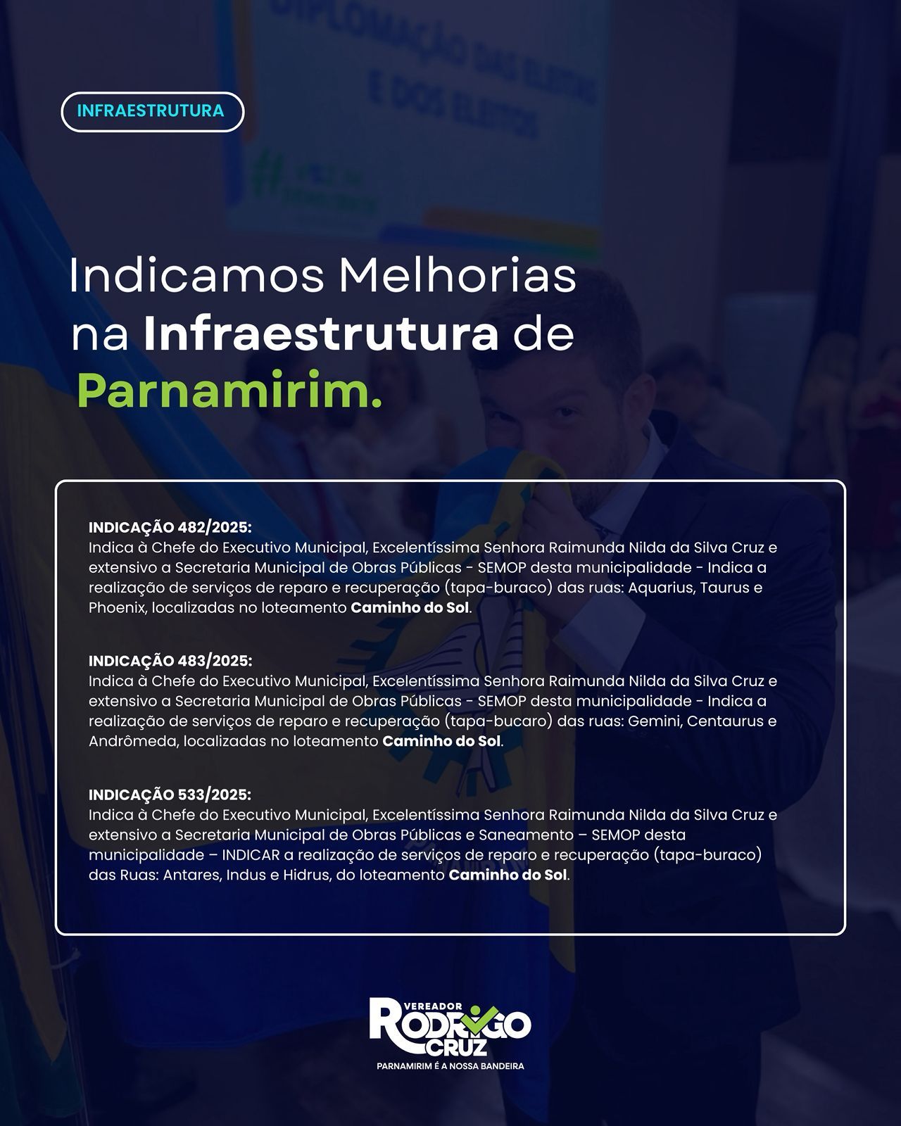 Em seu requerimento, Rodrigo Cruz argumentou que a manutenção dessas ruas é essencial para garantir a mobilidade urbana e a qualidade de vida dos moradores da região. “São vias utilizadas diariamente por famílias, motociclistas e condutores de transporte escolar. A falta de reparos pode levar a prejuízos financeiros e até mesmo colocar vidas em risco”, afirmou o vereador.