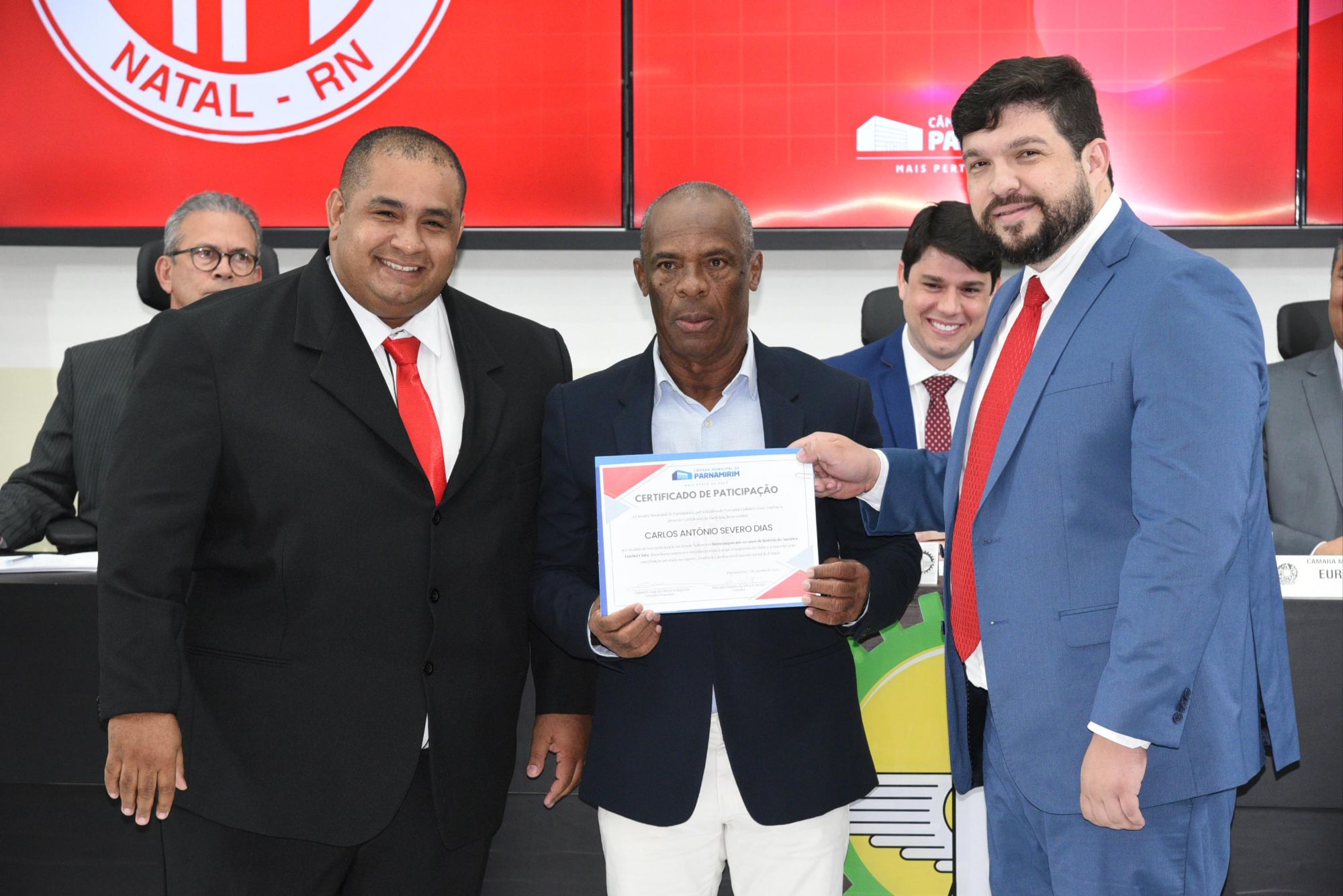 Em uma sessão solene na Câmara Municipal de Parnamirim, o vereador Chicão prestou homenagem a ex-atletas que fizeram história no América Futebol Clube, celebrando os 110 anos do clube. Foram reconhecidos nomes como João Maria de Azevedo (Baica), Newton Lima do Nascimento (Newton), Mirabôr de Souza Rocha (Mirabôr), Carlos Antonio Severinho (Severo), Joellan Paulo de Medeiros Santos (Joellan) e Hélio das Chagas do Nascimento (Helinho), destacando suas contribuições para o esporte potiguar.